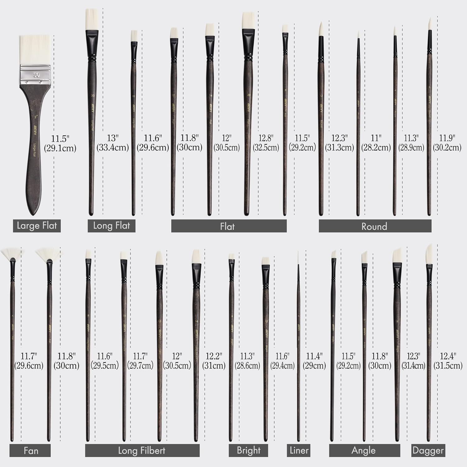 - VERSATILE ASSORTMENT - The 15 long handle brushes have a luxurious Brush Selection. Fan: Size 4, 8; Flat: Size 2, 6, 10, 14, 18, 30; Round: Size 2, 6, 8, 12, 14, 20; Flat Brush: Size 5.